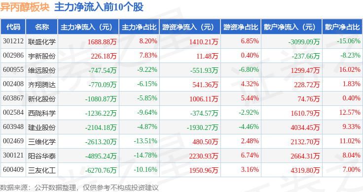 从资金流向上来看,当日异丙醇板块主力资金净流出6.64亿元,游资资金净流入3919.17万元,散户资金净流入6.25亿元。异丙醇板块个股资金流向见下表: