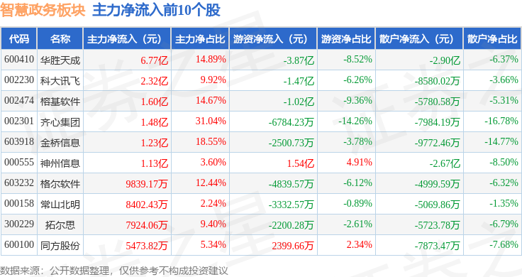 从资金流向上来看,当日智慧政务板块主力资金净流入5.48亿元,游资资金净流出5722.45万元,散户资金净流出4.91亿元。智慧政务板块个股资金流向见下表: