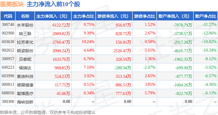 从资金流向上来看,当日医美板块主力资金净流出11.52亿元,游资资金净流入2.11亿元,散户资金净流入9.41亿元。医美板块个股资金流向见下表: