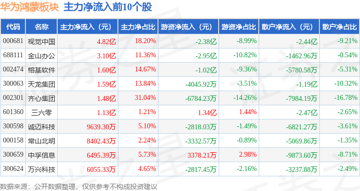从资金流向上来看,当日华为鸿蒙板块主力资金净流入10.11亿元,游资资金净流出4.6亿元,散户资金净流出5.51亿元。华为鸿蒙板块个股资金流向见下表: