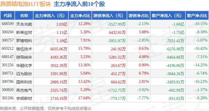 从资金流向上来看,当日异质结电池HJT板块主力资金净流出25.31亿元,游资资金净流入3.15亿元,散户资金净流入22.16亿元。异质结电池HJT板块个股资金流向见下表: