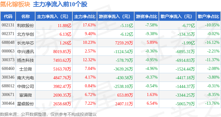 从资金流向上来看,当日氮化镓板块主力资金净流出4.42亿元,游资资金净流出12.12亿元,散户资金净流入16.53亿元。氮化镓板块个股资金流向见下表: