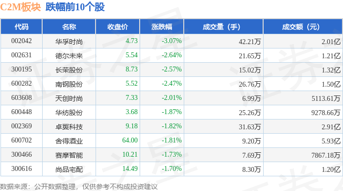 证券之星消息,11月18日C2M板块较上一交易日下跌0.95%,华孚时尚领跌。当日上证指数报收于3939.81,下跌0.81%。深证成指报收于13080.49,下跌0.92%。C2M板块个股涨跌见下表: