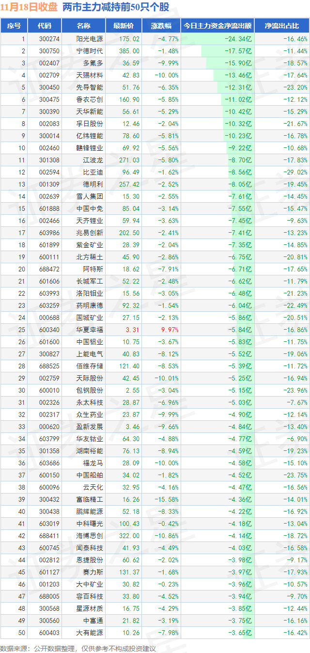 两市主力减持最多的前十只个股为: