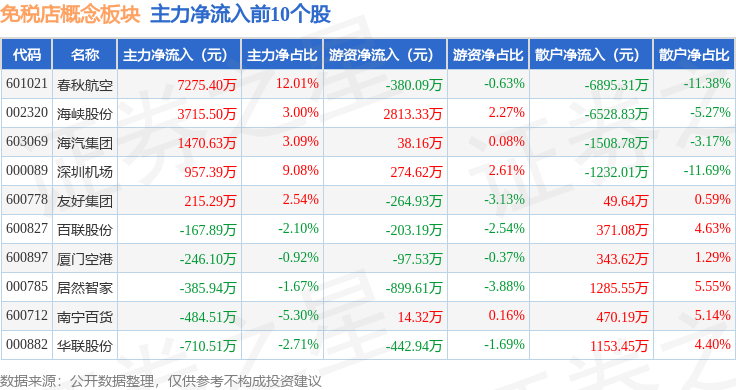 从资金流向上来看,当日免税店概念板块主力资金净流出19.11亿元,游资资金净流入2.66亿元,散户资金净流入16.45亿元。免税店概念板块个股资金流向见下表: