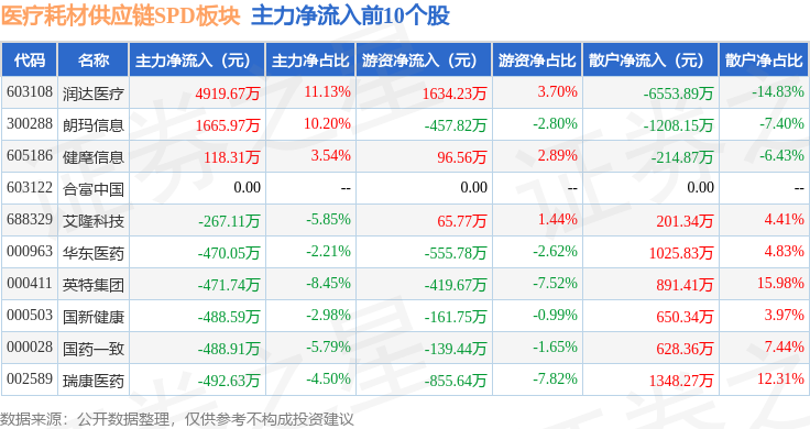 从资金流向上来看,当日医疗耗材供应链SPD板块主力资金净流出2.03亿元,游资资金净流出4400.58万元,散户资金净流入2.47亿元。医疗耗材供应链SPD板块个股资金流向见下表: