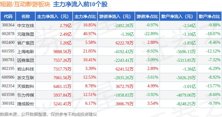 从资金流向上来看,当日短剧/互动影游板块主力资金净流入11.68亿元,游资资金净流出1174.03万元,散户资金净流出11.56亿元。短剧/互动影游板块个股资金流向见下表: