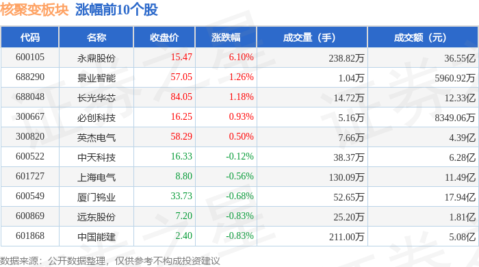 证券之星消息,11月18日核聚变板块较上一交易日下跌1.73%,海陆重工领跌。当日上证指数报收于3939.81,下跌0.81%。深证成指报收于13080.49,下跌0.92%。核聚变板块个股涨跌见下表: