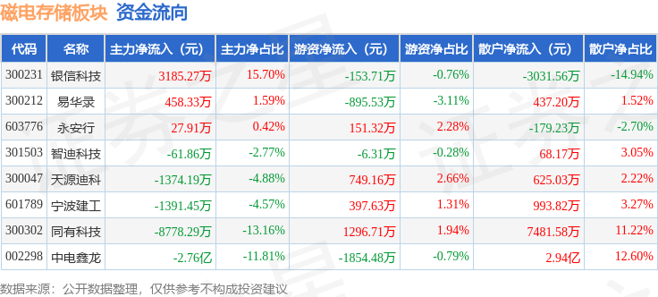 从资金流向上来看,当日磁电存储板块主力资金净流出3.55亿元,游资资金净流出315.21万元,散户资金净流入3.58亿元。磁电存储板块个股资金流向见下表: