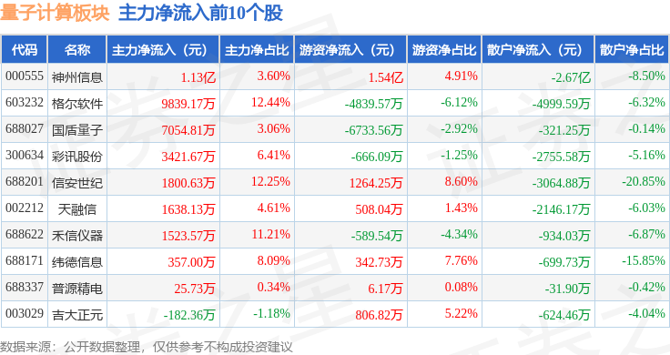 从资金流向上来看,当日量子计算板块主力资金净流出4493.38万元,游资资金净流入3.47亿元,散户资金净流出3.02亿元。量子计算板块个股资金流向见下表: