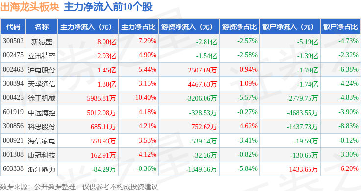从资金流向上来看,当日出海龙头板块主力资金净流出51.75亿元,游资资金净流入16.39亿元,散户资金净流入35.36亿元。出海龙头板块个股资金流向见下表: