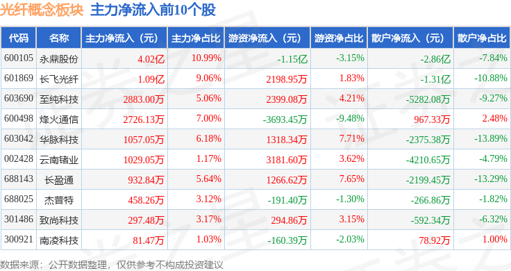 从资金流向上来看,当日光纤概念板块主力资金净流入6529.32万元,游资资金净流入2.88亿元,散户资金净流出3.54亿元。光纤概念板块个股资金流向见下表: