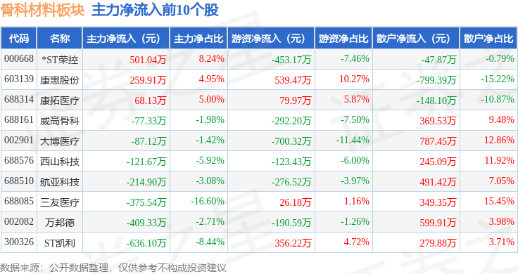 从资金流向上来看,当日骨科材料板块主力资金净流出1.44亿元,游资资金净流入3086.67万元,散户资金净流入1.13亿元。骨科材料板块个股资金流向见下表: