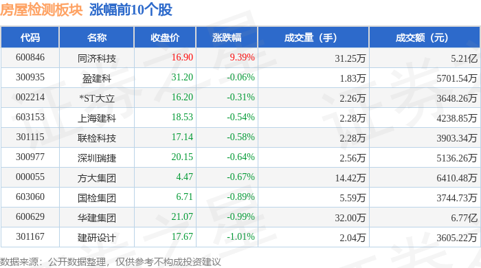 证券之星消息,11月18日房屋检测板块较上一交易日下跌0.9%,招标股份领跌。当日上证指数报收于3939.81,下跌0.81%。深证成指报收于13080.49,下跌0.92%。房屋检测板块个股涨跌见下表: