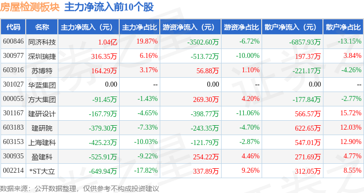 从资金流向上来看,当日房屋检测板块主力资金净流出4.47亿元,游资资金净流出2893.79万元,散户资金净流入4.76亿元。房屋检测板块个股资金流向见下表: