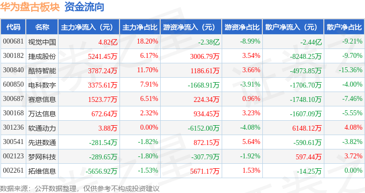 从资金流向上来看,当日华为盘古板块主力资金净流入5.65亿元,游资资金净流出2.0亿元,散户资金净流出3.65亿元。华为盘古板块个股资金流向见下表: