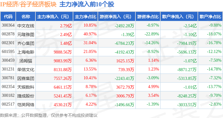 从资金流向上来看,当日IP经济/谷子经济板块主力资金净流出2.8亿元,游资资金净流出4770.48万元,散户资金净流入3.28亿元。IP经济/谷子经济板块个股资金流向见下表: