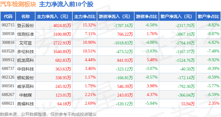 从资金流向上来看,当日汽车检测板块主力资金净流出4.04亿元,游资资金净流入4802.24万元,散户资金净流入3.56亿元。汽车检测板块个股资金流向见下表: