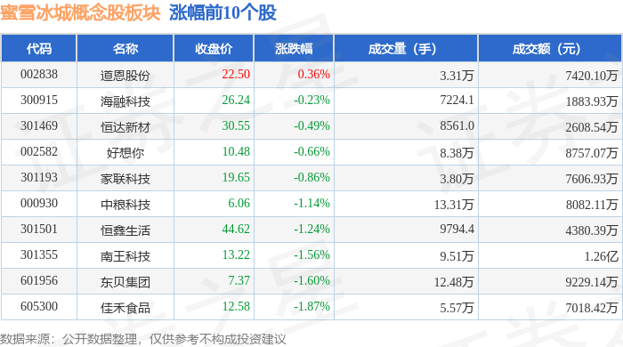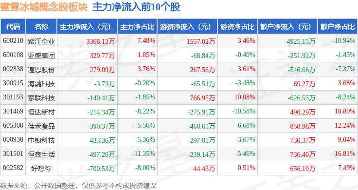 从资金流向上来看,当日蜜雪冰城概念股板块主力资金净流出8584.21万元,游资资金净流入3873.11万元,散户资金净流入4711.1万元。蜜雪冰城概念股板块个股资金流向见下表: