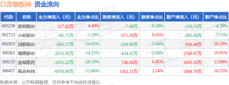 从资金流向上来看,当日口含烟板块主力资金净流出1.21亿元,游资资金净流入1886.72万元,散户资金净流入1.02亿元。口含烟板块个股资金流向见下表: