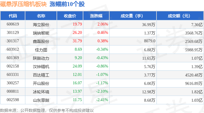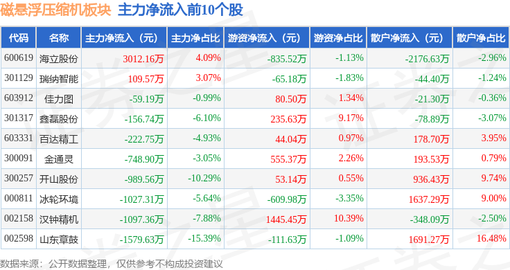 从资金流向上来看,当日磁悬浮压缩机板块主力资金净流出8.33亿元,游资资金净流入1.79亿元,散户资金净流入6.54亿元。磁悬浮压缩机板块个股资金流向见下表: