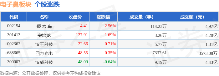 证券之星消息,11月18日电子鼻板块较上一交易日上涨0.6%,报 喜 鸟领涨。当日上证指数报收于3939.81,下跌0.81%。深证成指报收于13080.49,下跌0.92%。电子鼻板块个股涨跌见下表: