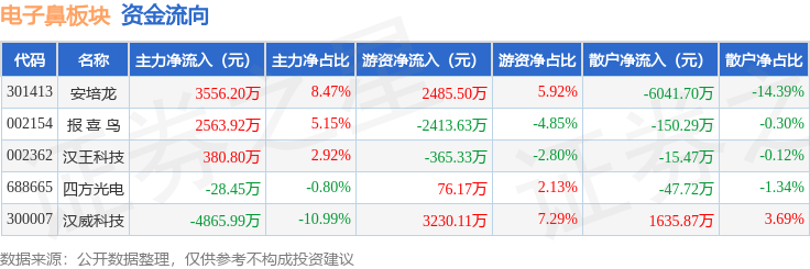 从资金流向上来看,当日电子鼻板块主力资金净流入1606.48万元,游资资金净流入3012.82万元,散户资金净流出4619.3万元。电子鼻板块个股资金流向见下表: