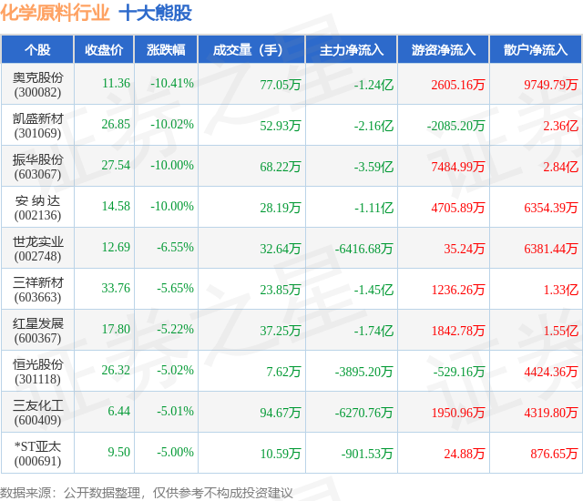 个股表现方面,化学原料行业当日领跌股为奥克股份(300082),该股当日报收11.36,下跌10.41%,成交量77.05万,主力资金净流出1.24亿元。凯盛新材(301069)以下跌10.02%紧随其后,该股当日成交量52.93万,主力资金净流出2.16亿元。除此之外,振华股份(603067)、安 纳 达(002136)、世龙实业(002748)均进入当日熊股之列。具体个股列表见下表: