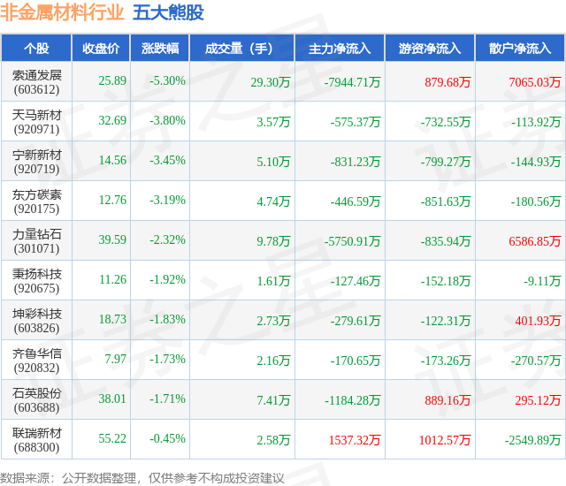 个股表现方面,非金属材料行业当日领跌股为索通发展(603612),该股当日报收25.89,下跌5.3%,成交量29.3万,主力资金净流出7944.71万元。天马新材(920971)以下跌3.8%紧随其后,该股当日成交量3.57万,主力资金净流出575.37万元。除此之外,宁新新材(920719)、东方碳素(920175)、力量钻石(301071)均进入当日熊股之列。具体个股列表见下表: