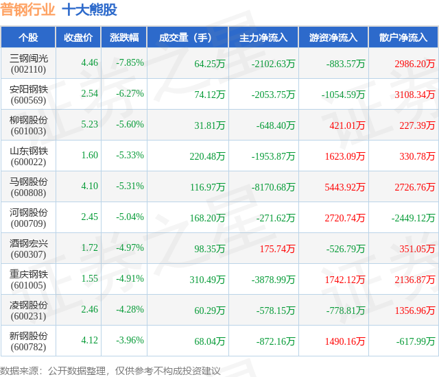 个股表现方面,普钢行业当日领跌股为三钢闽光(002110),该股当日报收4.46,下跌7.85%,成交量64.25万,主力资金净流出2102.63万元。安阳钢铁(600569)以下跌6.27%紧随其后,该股当日成交量74.12万,主力资金净流出2053.75万元。除此之外,柳钢股份(601003)、山东钢铁(600022)、马钢股份(600808)均进入当日熊股之列。具体个股列表见下表: