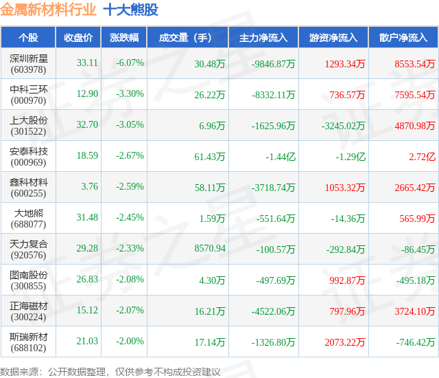 个股表现方面,金属新材料行业当日领跌股为深圳新星(603978),该股当日报收33.11,下跌6.07%,成交量30.48万,主力资金净流出9846.87万元。中科三环(000970)以下跌3.3%紧随其后,该股当日成交量26.22万,主力资金净流出8332.11万元。除此之外,上大股份(301522)、安泰科技(000969)、鑫科材料(600255)均进入当日熊股之列。具体个股列表见下表: