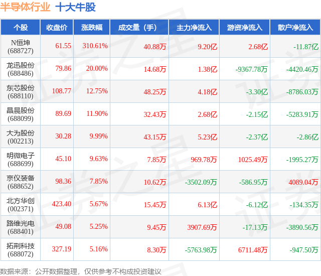 个股表现方面,半导体行业当日领涨股为N恒坤(688727),该股当日报收61.55,上涨310.61%,成交量40.88万,主力资金净流入9.2亿元。龙迅股份(688486)以上涨20.0%紧随其后,该股当日成交量14.68万,主力资金净流入1.38亿元。除此之外,东芯股份(688110)、晶晨股份(688099)、大为股份(002213)均进入当日牛股之列。具体个股列表见下表: