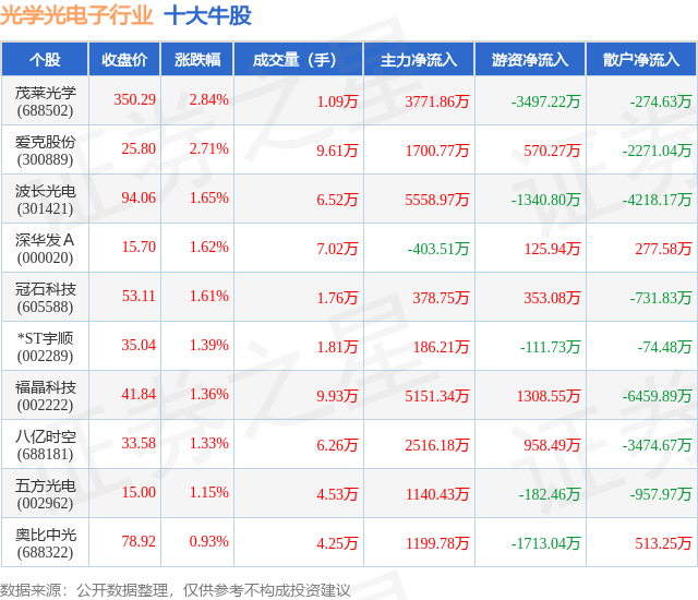 个股表现方面,光学光电子行业当日领涨股为茂莱光学(688502),该股当日报收350.29,上涨2.84%,成交量1.09万,主力资金净流入3771.86万元。爱克股份(300889)以上涨2.71%紧随其后,该股当日成交量9.61万,主力资金净流入1700.77万元。除此之外,波长光电(301421)、深华发A(000020)、冠石科技(605588)均进入当日牛股之列。具体个股列表见下表: