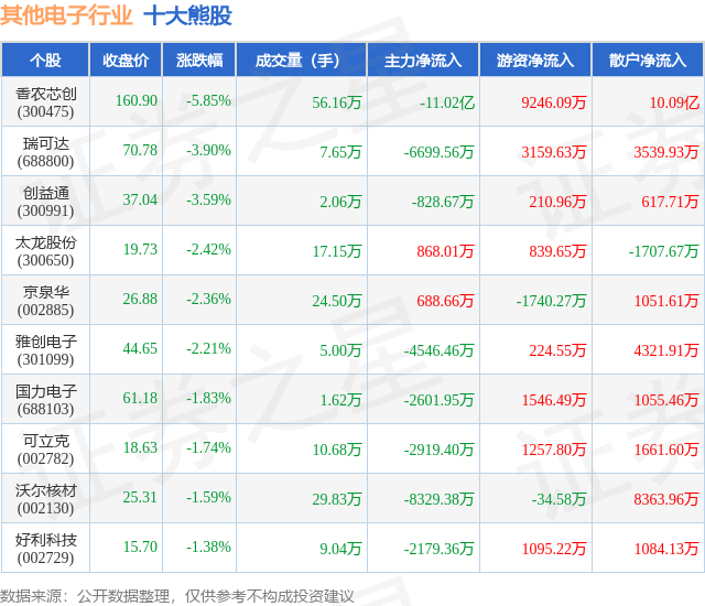 个股表现方面,其他电子行业当日领跌股为香农芯创(300475),该股当日报收160.9,下跌5.85%,成交量56.16万,主力资金净流出11.02亿元。瑞可达(688800)以下跌3.9%紧随其后,该股当日成交量7.65万,主力资金净流出6699.56万元。除此之外,创益通(300991)、太龙股份(300650)、京泉华(002885)均进入当日熊股之列。具体个股列表见下表: