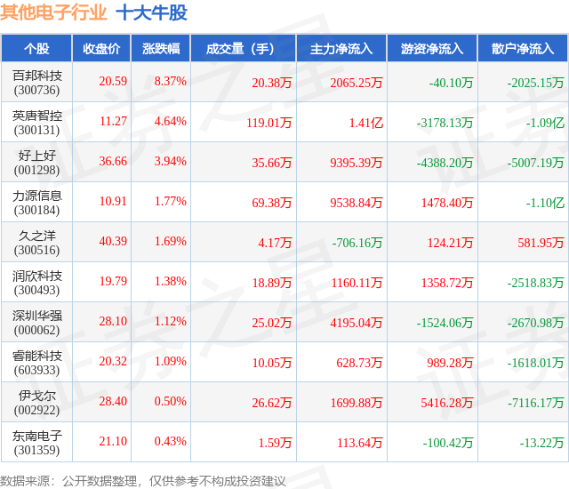 个股表现方面,其他电子行业当日领涨股为百邦科技(300736),该股当日报收20.59,上涨8.37%,成交量20.38万,主力资金净流入2065.25万元。英唐智控(300131)以上涨4.64%紧随其后,该股当日成交量119.01万,主力资金净流入1.41亿元。除此之外,好上好(001298)、力源信息(300184)、久之洋(300516)均进入当日牛股之列。具体个股列表见下表: