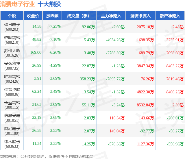 个股表现方面,消费电子行业当日领跌股为福日电子(600203),该股当日报收14.58,下跌7.25%,成交量92.06万,主力资金净流出2.69亿元。统联精密(688210)以下跌7.1%紧随其后,该股当日成交量5.43万,主力资金净流出4934.26万元。除此之外,苏州天脉(301626)、光弘科技(300735)、胜利精密(002426)均进入当日熊股之列。具体个股列表见下表:
