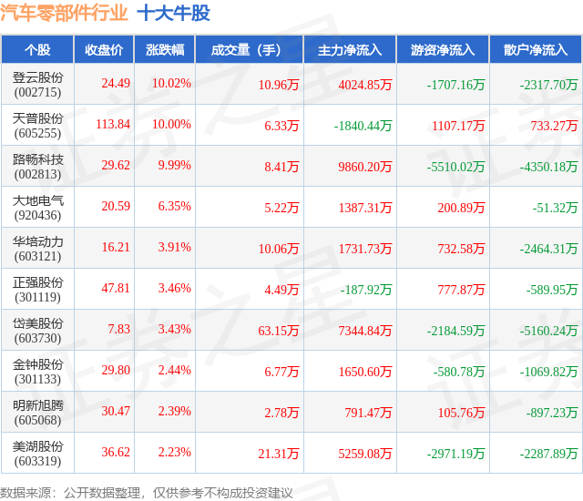个股表现方面,汽车零部件行业当日领涨股为登云股份(002715),该股当日报收24.49,上涨10.02%,成交量10.96万,主力资金净流入4024.85万元。天普股份(605255)以上涨10.0%紧随其后,该股当日成交量6.33万,主力资金净流出1840.44万元。除此之外,路畅科技(002813)、大地电气(920436)、华培动力(603121)均进入当日牛股之列。具体个股列表见下表: