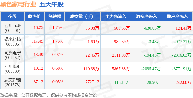 个股表现方面,黑色家电行业当日领涨股为四川九洲(000801),该股当日报收16.25,上涨1.75%,成交量35.98万,主力资金净流入505.65万元。极米科技(688696)以上涨1.73%紧随其后,该股当日成交量1.6万,主力资金净流入980.69万元。除此之外,同洲电子(002052)、四川长虹(600839)、辰奕智能(301578)均进入当日牛股之列。具体个股列表见下表: