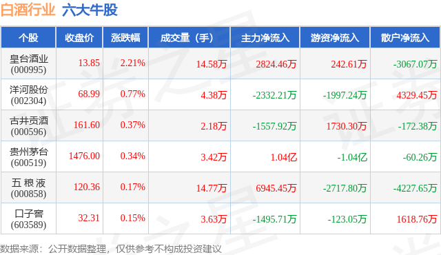 个股表现方面,白酒行业当日领涨股为皇台酒业(000995),该股当日报收13.85,上涨2.21%,成交量14.58万,主力资金净流入2824.46万元。洋河股份(002304)以上涨0.77%紧随其后,该股当日成交量4.38万,主力资金净流出2332.21万元。除此之外,古井贡酒(000596)、贵州茅台(600519)、五 粮 液(000858)均进入当日牛股之列。具体个股列表见下表: