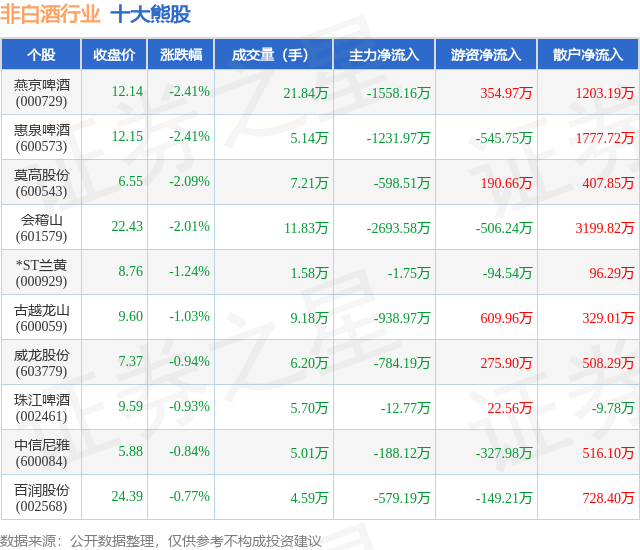 个股表现方面,非白酒行业当日领跌股为燕京啤酒(000729),该股当日报收12.14,下跌2.41%,成交量21.84万,主力资金净流出1558.16万元。惠泉啤酒(600573)以下跌2.41%紧随其后,该股当日成交量5.14万,主力资金净流出1231.97万元。除此之外,莫高股份(600543)、会稽山(601579)、*ST兰黄(000929)均进入当日熊股之列。具体个股列表见下表: