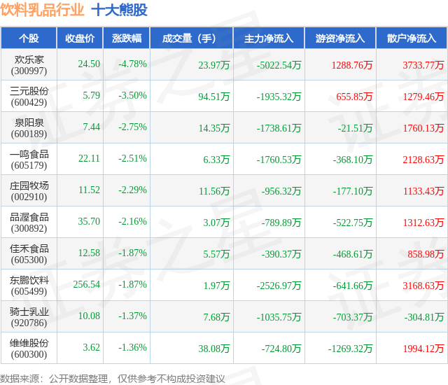 个股表现方面,饮料乳品行业当日领跌股为欢乐家(300997),该股当日报收24.5,下跌4.78%,成交量23.97万,主力资金净流出5022.54万元。三元股份(600429)以下跌3.5%紧随其后,该股当日成交量94.51万,主力资金净流出1935.32万元。除此之外,泉阳泉(600189)、一鸣食品(605179)、庄园牧场(002910)均进入当日熊股之列。具体个股列表见下表: