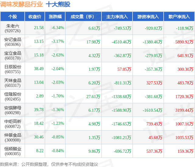 个股表现方面,调味发酵品行业当日领跌股为朱老六(920726),该股当日报收21.58,下跌6.34%,成交量6.61万,主力资金净流出749.53万元。安记食品(603696)以下跌3.17%紧随其后,该股当日成交量17.98万,主力资金净流出4510.46万元。除此之外,宝立食品(603170)、日辰股份(603755)、天味食品(603317)均进入当日熊股之列。具体个股列表见下表: