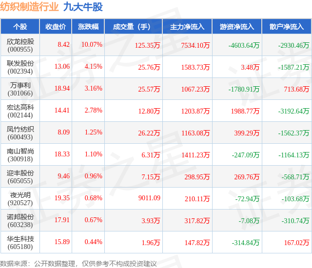 个股表现方面,纺织制造行业当日领涨股为欣龙控股(000955),该股当日报收8.42,上涨10.07%,成交量125.35万,主力资金净流入7534.1万元。联发股份(002394)以上涨4.15%紧随其后,该股当日成交量25.76万,主力资金净流入1583.73万元。除此之外,万事利(301066)、宏达高科(002144)、凤竹纺织(600493)均进入当日牛股之列。具体个股列表见下表:
