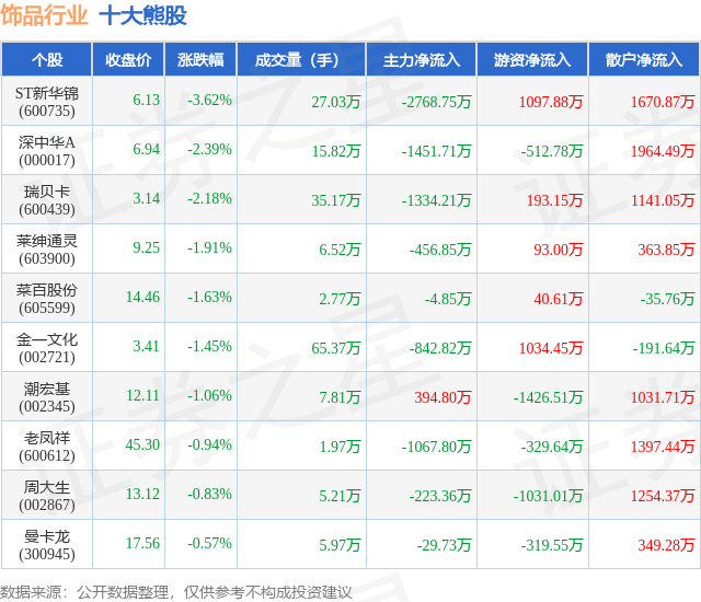个股表现方面,饰品行业当日领跌股为ST新华锦(600735),该股当日报收6.13,下跌3.62%,成交量27.03万,主力资金净流出2768.75万元。深中华A(000017)以下跌2.39%紧随其后,该股当日成交量15.82万,主力资金净流出1451.71万元。除此之外,瑞贝卡(600439)、莱绅通灵(603900)、菜百股份(605599)均进入当日熊股之列。具体个股列表见下表: