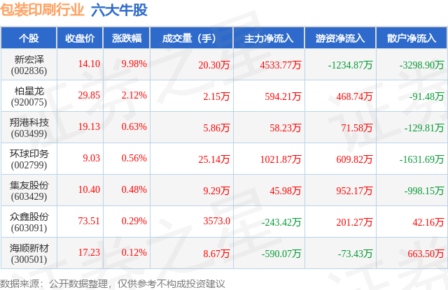 个股表现方面,包装印刷行业当日领涨股为新宏泽(002836),该股当日报收14.1,上涨9.98%,成交量20.3万,主力资金净流入4533.77万元。柏星龙(920075)以上涨2.12%紧随其后,该股当日成交量2.15万,主力资金净流入594.21万元。除此之外,翔港科技(603499)、环球印务(002799)、集友股份(603429)均进入当日牛股之列。具体个股列表见下表: