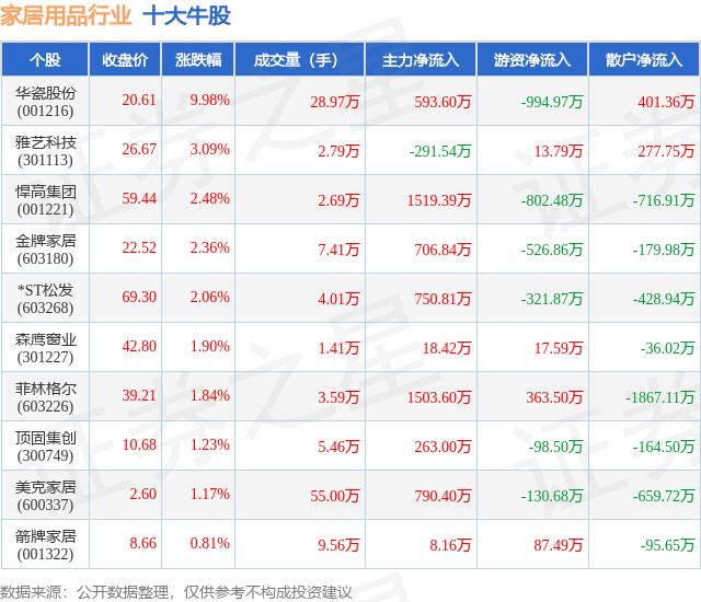 个股表现方面,家居用品行业当日领涨股为华瓷股份(001216),该股当日报收20.61,上涨9.98%,成交量28.97万,主力资金净流入593.6万元。雅艺科技(301113)以上涨3.09%紧随其后,该股当日成交量2.79万,主力资金净流出291.54万元。除此之外,悍高集团(001221)、金牌家居(603180)、*ST松发(603268)均进入当日牛股之列。具体个股列表见下表: