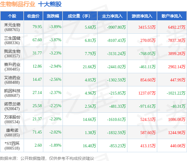 个股表现方面,生物制品行业当日领跌股为禾元生物(688765),该股当日报收79.95,下跌3.89%,成交量5.68万,主力资金净流出9907.8万元。三生国健(688336)以下跌3.87%紧随其后,该股当日成交量6.81万,主力资金净流出8107.43万元。除此之外,我武生物(300357)、赛升药业(300485)、艾迪药业(688488)均进入当日熊股之列。具体个股列表见下表: