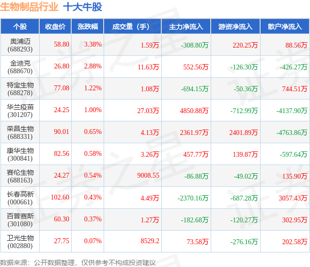 个股表现方面,生物制品行业当日领涨股为奥浦迈(688293),该股当日报收58.8,上涨3.38%,成交量1.59万,主力资金净流出308.8万元。金迪克(688670)以上涨2.88%紧随其后,该股当日成交量11.63万,主力资金净流入552.56万元。除此之外,特宝生物(688278)、华兰疫苗(301207)、荣昌生物(688331)均进入当日牛股之列。具体个股列表见下表: