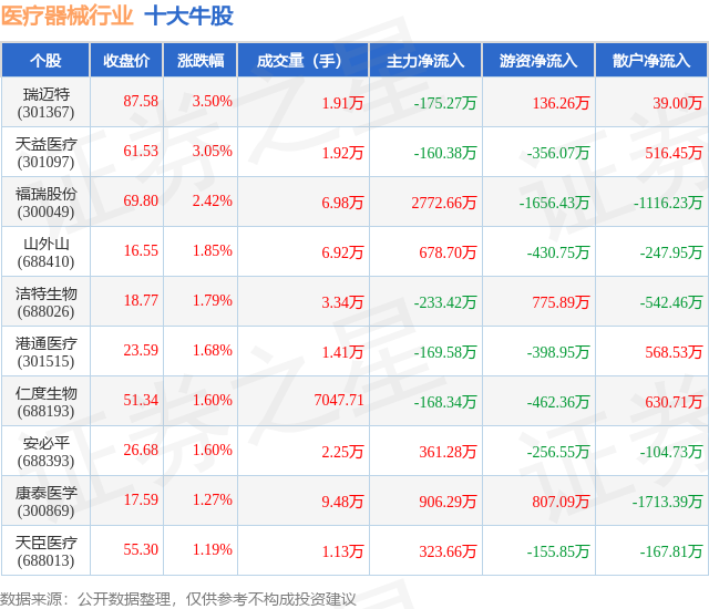 个股表现方面,医疗器械行业当日领涨股为瑞迈特(301367),该股当日报收87.58,上涨3.5%,成交量1.91万,主力资金净流出175.27万元。天益医疗(301097)以上涨3.05%紧随其后,该股当日成交量1.92万,主力资金净流出160.38万元。除此之外,福瑞股份(300049)、山外山(688410)、洁特生物(688026)均进入当日牛股之列。具体个股列表见下表: