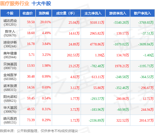 个股表现方面,医疗服务行业当日领涨股为诚达药业(301201),该股当日报收59.5,上涨20.01%,成交量25.04万,主力资金净流入9310.11万元。数字人(920670)以上涨4.49%紧随其后,该股当日成交量14.61万,主力资金净流入2965.82万元。除此之外,迪安诊断(300244)、美年健康(002044)、贝瑞基因(000710)均进入当日牛股之列。具体个股列表见下表: